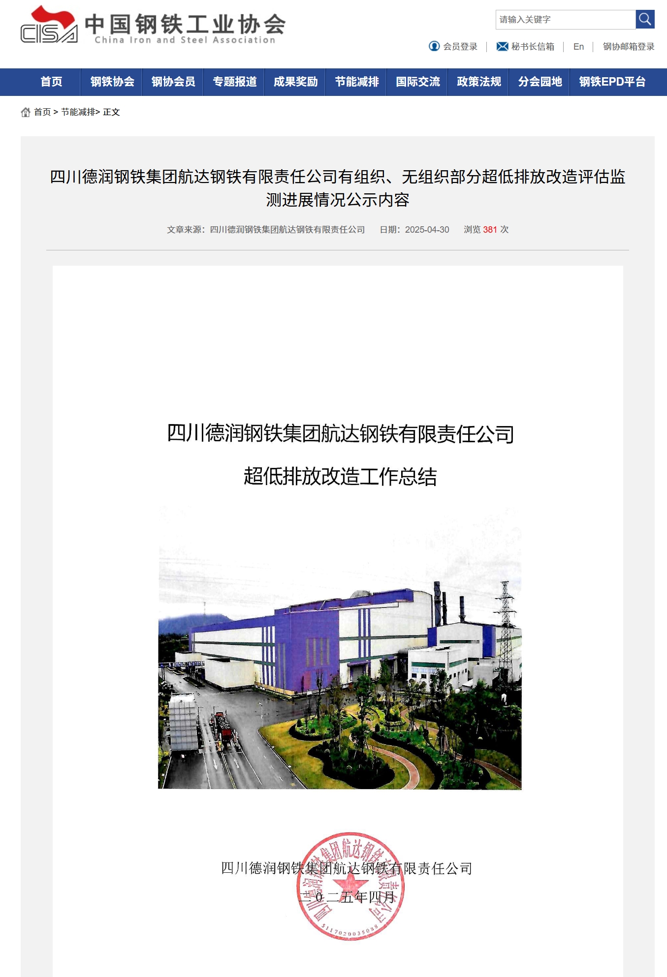 4月30日,中国钢铁工业协会对四川德润钢铁集团航达钢铁有限责任公司超低排放有组织、无组织改造评估监测进展情况进行公示,这标志着德润航达钢铁在绿色制造、环保升级方面迈出了坚实的一步,实现了超低排放有组织、无组织改造目标,彰显了公司坚定不移走生态优先、绿色发展道路的决心,对推动德润航达钢铁绿色转型、促进区域生态环境改善具有重要意义。