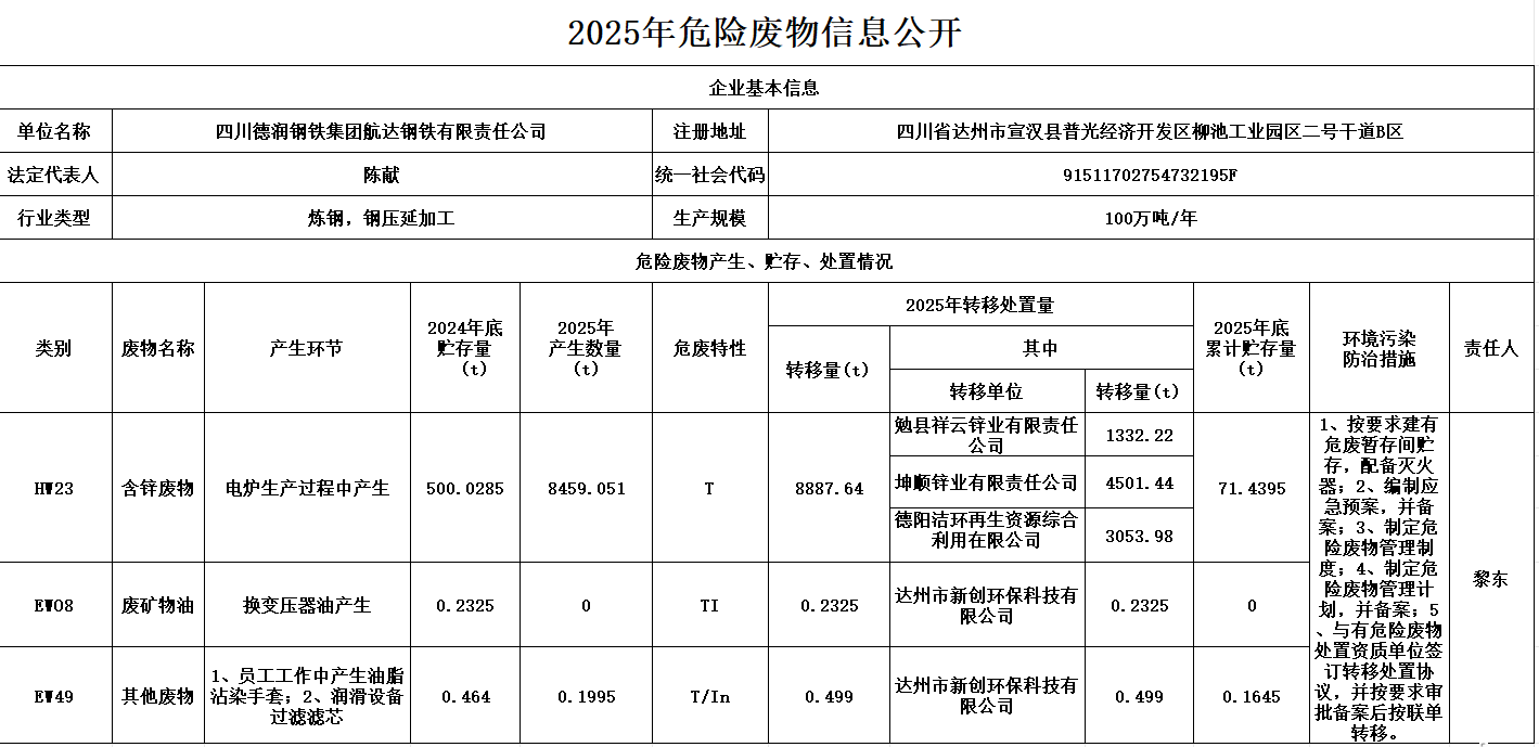 首页 > 新闻资讯 > 集团要闻 > 四川德润钢铁集团航达钢铁有限责任公司2025年危险废物信息公开
